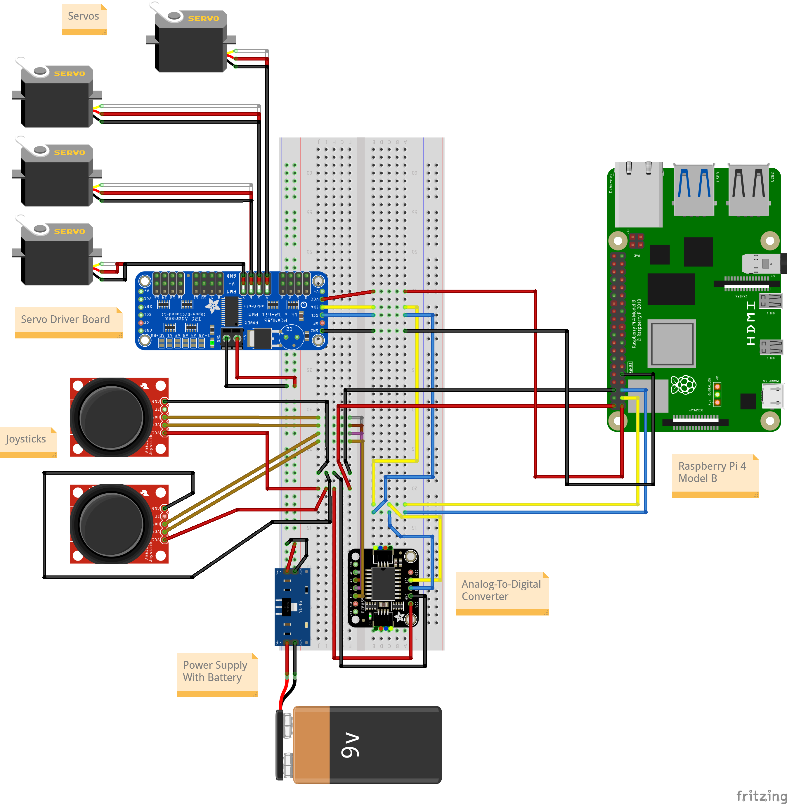 | Analog-To-Digital Converter | Used to convert analog output signal of joysticks to digital input values for the Raspberry Pi | $9.99 | Link |